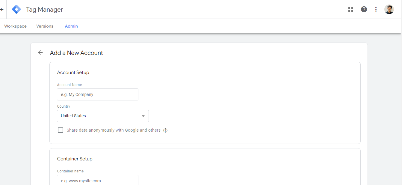 You need to provide your Name, Country and the Container ID (Website on which you want to set up the tracking).