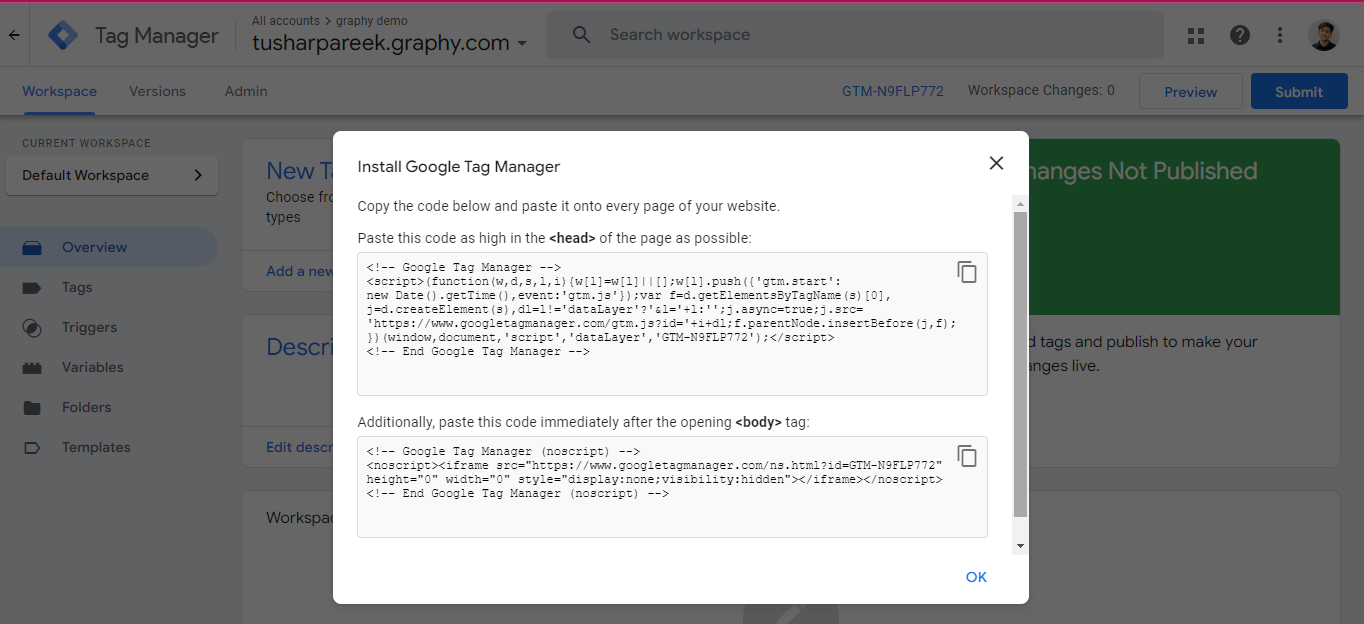 In graphy websites, you don't need to paste the code anywhere, we can simply close this pop-up window, and you will be redirected to the homepage of Google Tag Manager.