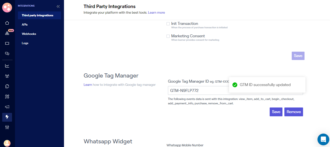 After you paste the GTM ID in the third party integration section of Graphy’s dashboard, the website will automatically be integrated with the Google Tag Manager.