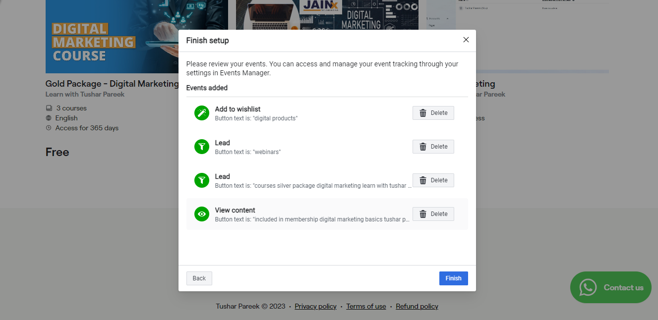 Once you are done assigning events to different buttons and URLs, you can just click on the “Finish Setup” button, and you would be shown all the different events which you have created on the website, you can even re-confirm them and click on the "Finish" button.