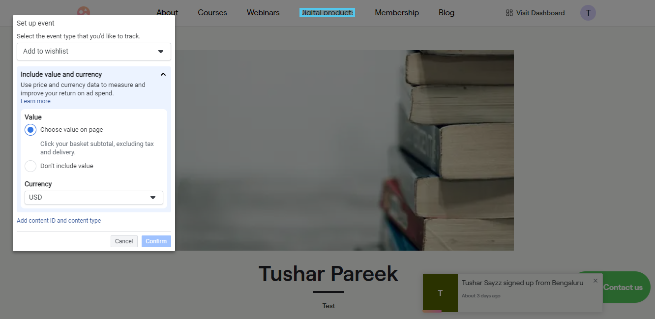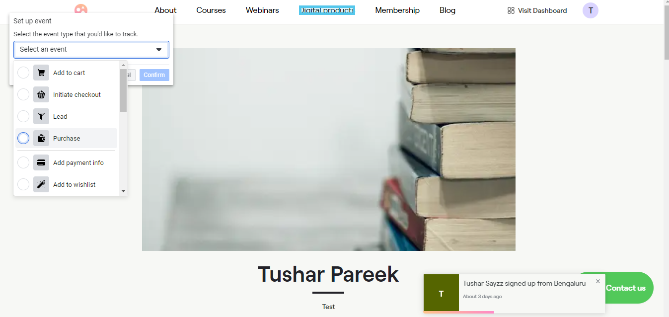 Here, you have chosen the “Digital Products” button and you are now assigning it a specific event (You can assign any button to any event, Event will only trigger when you click on that specific button).